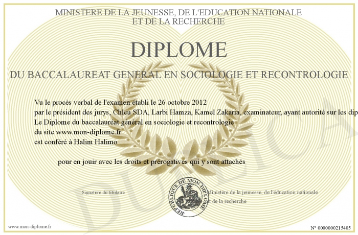 Envoyez par email votre Diplôme du baccalauréat général en sociologie et recontrologie personalisé