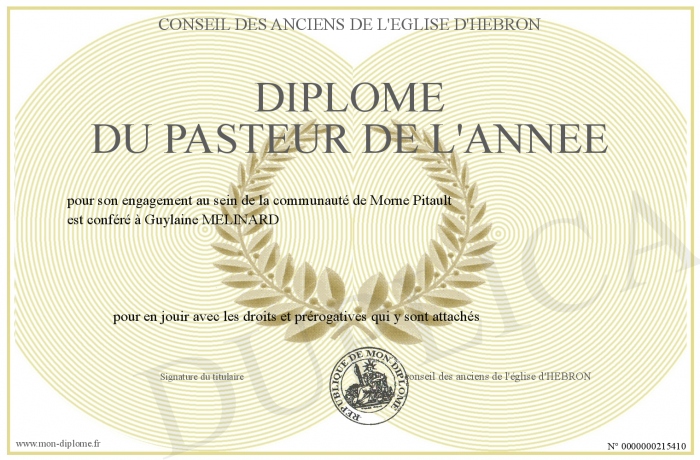 Envoyez par email votre Diplôme du pasteur de l'année personalisé