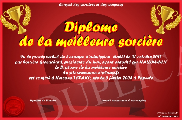 Envoyez par email votre Diplôme de la meilleure sorcière personalisé