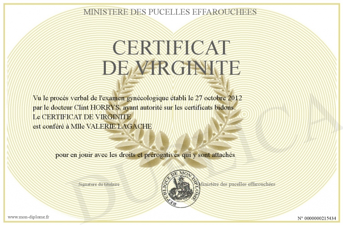 Envoyez par email votre CERTIFICAT DE VIRGINITE personalisé
