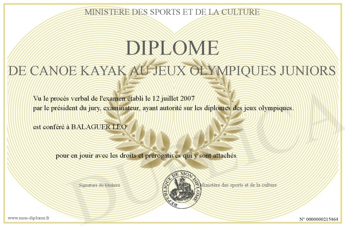 Envoyez par email votre Diplome de canoe kayak au jeux olympiques juniors personalisé