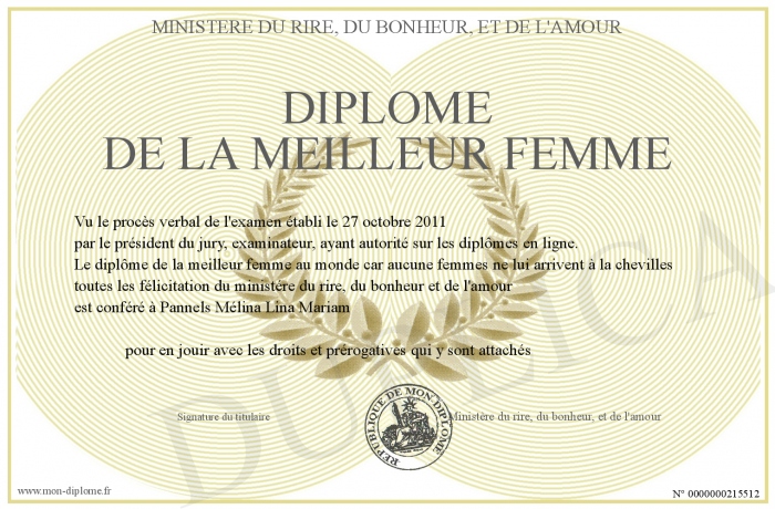 Envoyez par email votre Diplôme de la meilleur femme personalisé