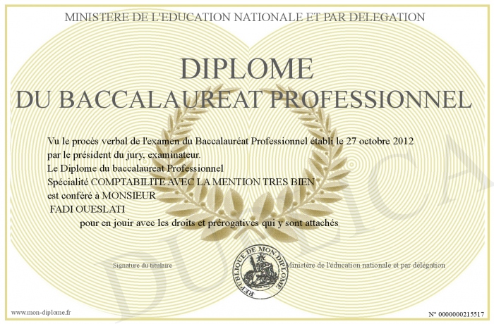 Envoyez par email votre Diplôme du baccalaureat Professionnel personalisé