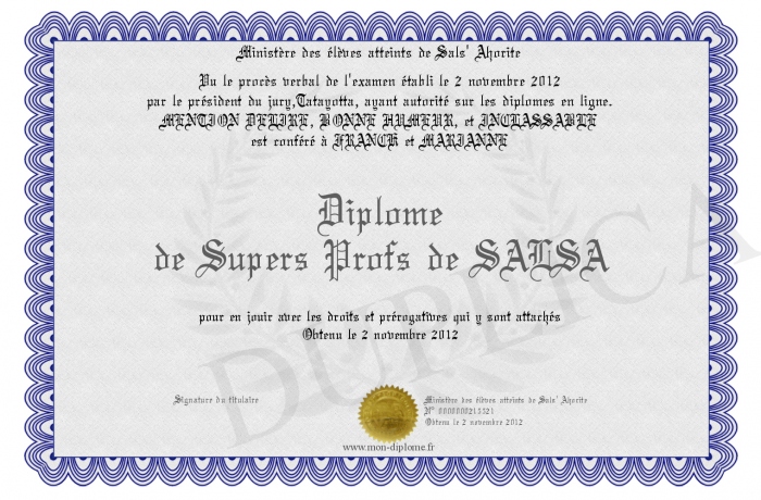 Envoyez par email votre Diplôme de Supers Profs de SALSA personalisé