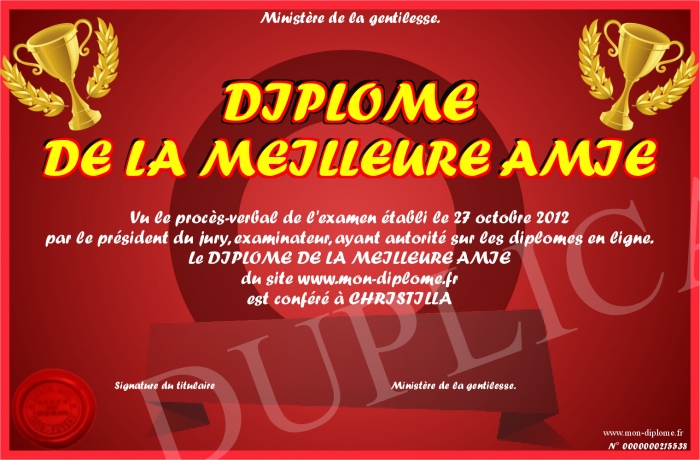 Envoyez par email votre DIPLOME DE LA MEILLEURE AMIE personalisé