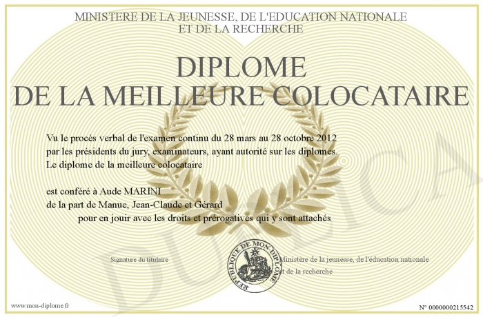 Envoyez par email votre Diplôme de la meilleure colocataire personalisé