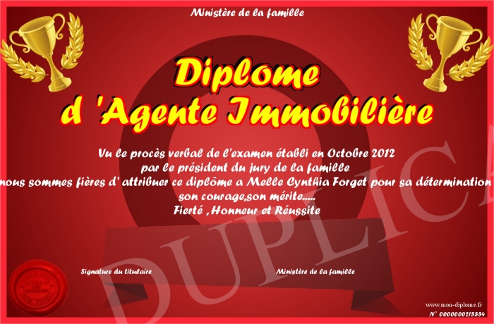 Envoyez par email votre Diplôme d 'Agente Immobilière personalisé
