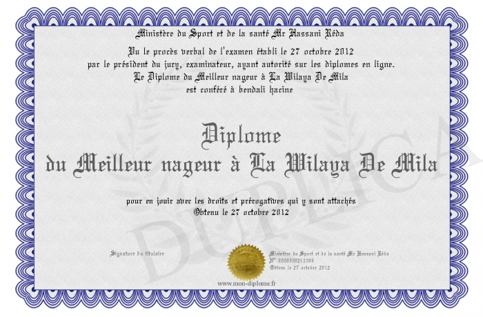 Envoyez par email votre Diplome du Meilleur nageur à La Wilaya De Mila personalisé