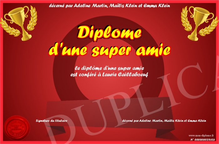 Envoyez par email votre Diplôme d'une super amie personalisé
