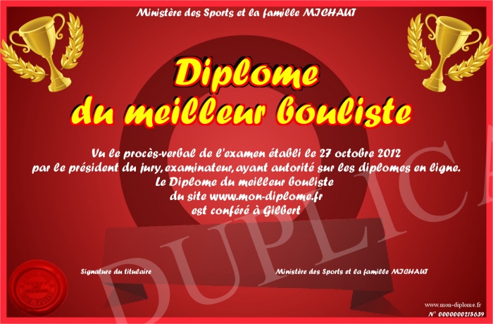 Envoyez par email votre Diplôme du meilleur bouliste personalisé