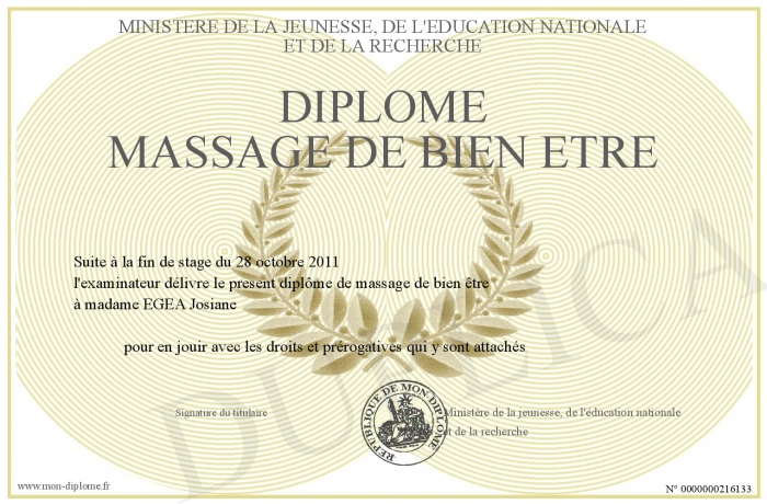 Envoyez par email votre Diplôme massage de bien étre personalisé