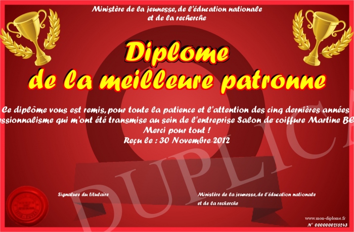 Envoyez par email votre Diplôme de la meilleure patronne personalisé
