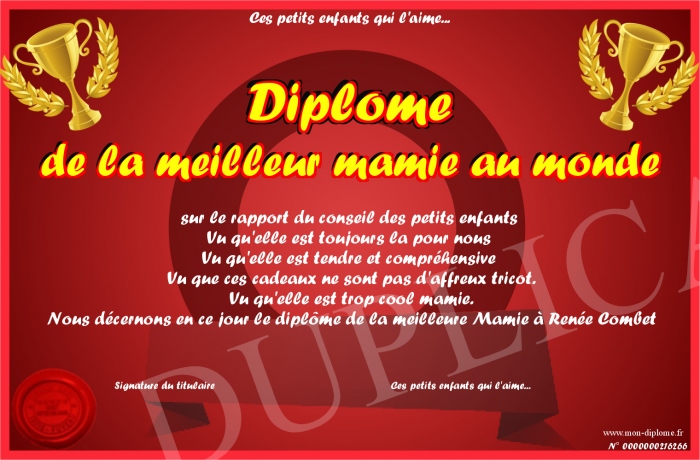 Envoyez par email votre Diplôme de la meilleur mamie au monde personalisé