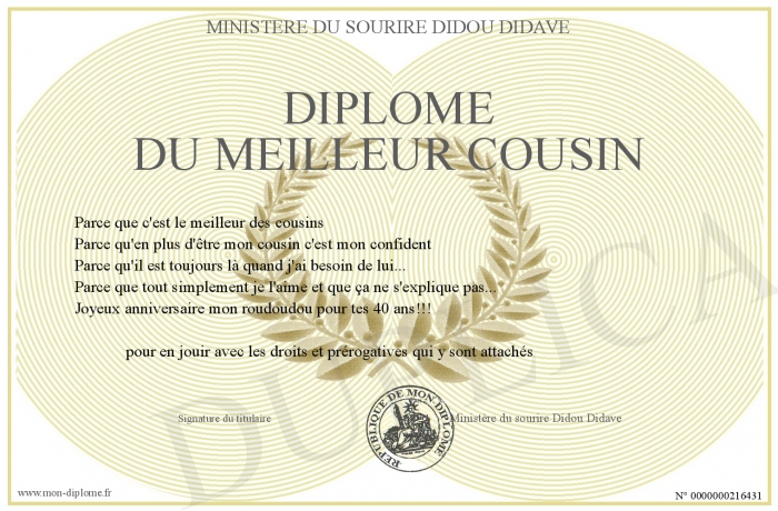Envoyez par email votre Diplôme du Meilleur Cousin personalisé