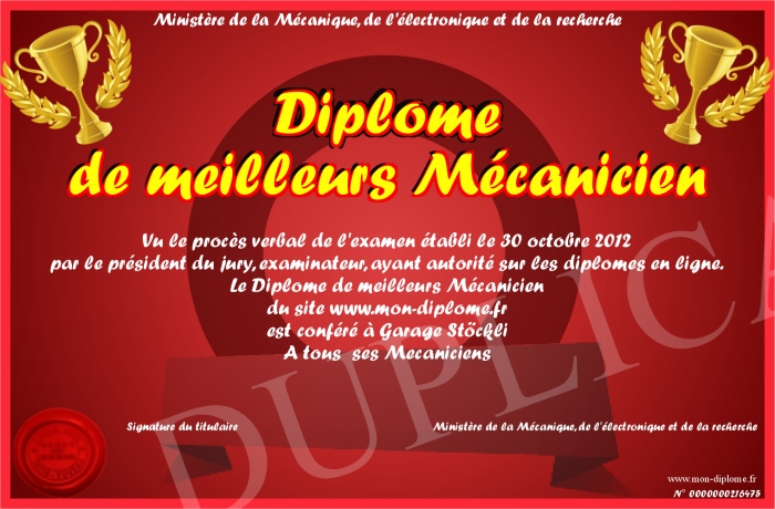 Envoyez par email votre Diplôme de meilleurs Mécanicien personalisé