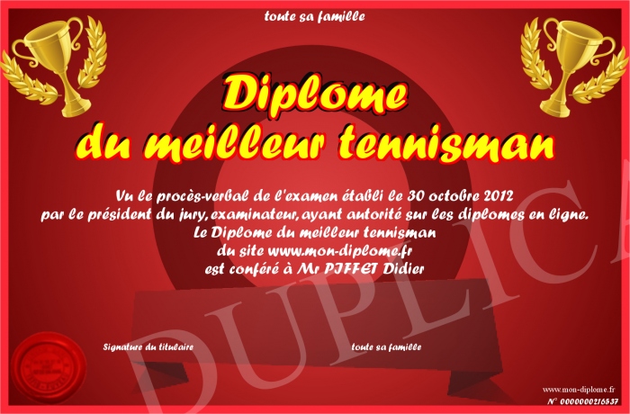 Envoyez par email votre Diplôme du meilleur tennisman personalisé