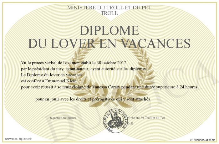 Envoyez par email votre Diplôme du lover en vacances personalisé