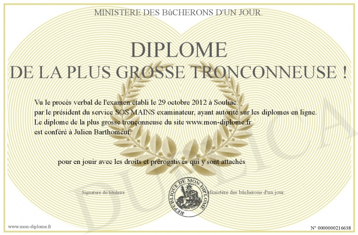 Envoyez par email votre Diplôme de la plus grosse tronconneuse ! personalisé