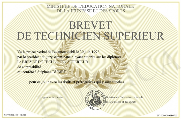 Envoyez par email votre BREVET DE TECHNICIEN SUPERIEUR personalisé