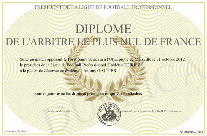 Envoyez par email votre Diplôme de l'arbitre le plus nul de France personalisé