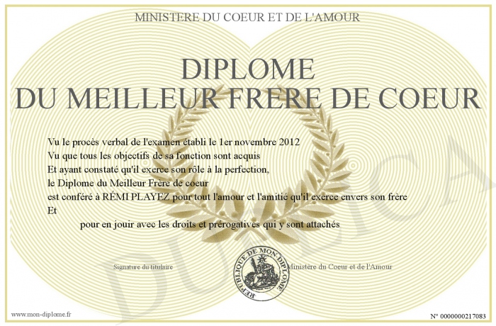 Envoyez par email votre Diplôme du Meilleur Frère de coeur personalisé