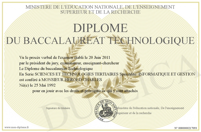 Envoyez par email votre Diplôme du baccalauréat Technologique personalisé