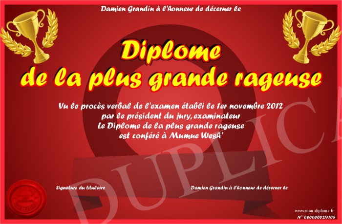 Envoyez par email votre Diplôme de la plus grande rageuse personalisé