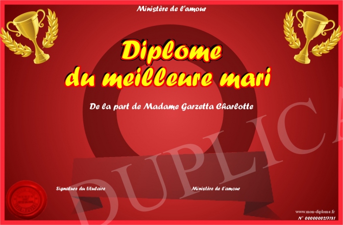 Envoyez par email votre Diplôme du meilleure mari personalisé