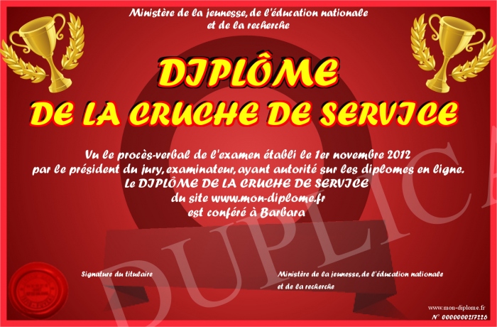 Envoyez par email votre DIPLÔME DE LA CRUCHE DE SERVICE personalisé