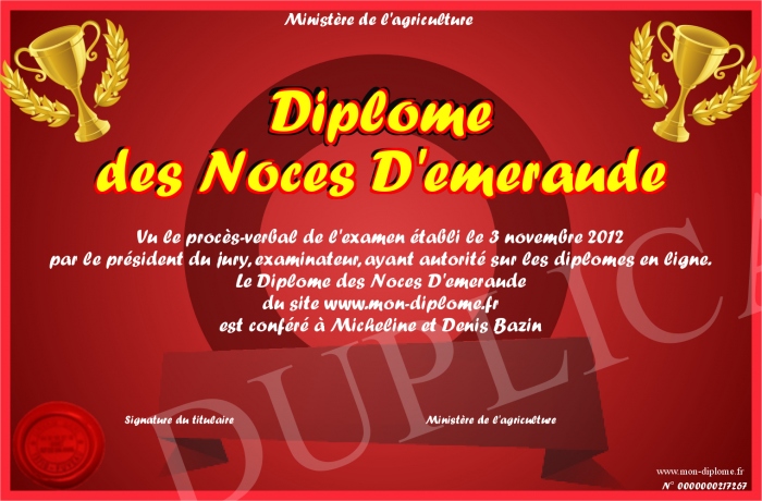 Envoyez par email votre Diplôme des Noces D'emeraude personalisé