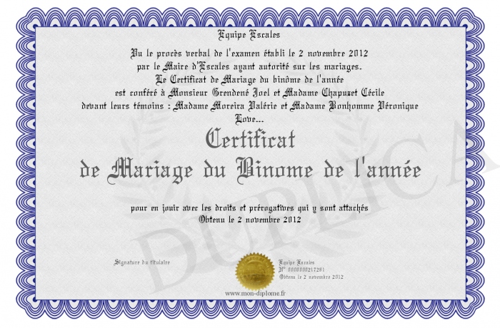 Envoyez par email votre Certificat de Mariage du Binôme de l'année personalisé