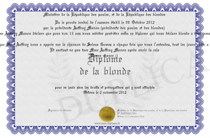 envoyé par le Ministère de la République des poules, et de la République des blondes !