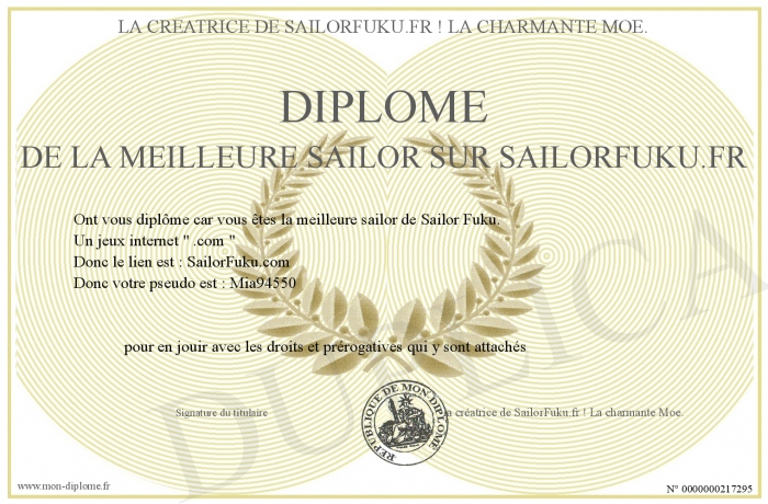 Envoyez par email votre Diplôme de la meilleure sailor sur SailorFuku.fr personalisé