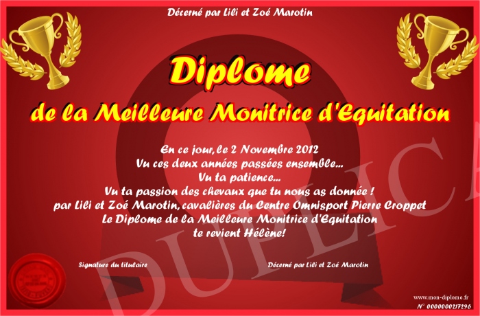 Envoyez par email votre Diplôme de la Meilleure Monitrice d'Equitation personalisé