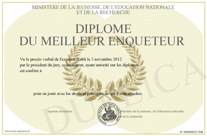 Envoyez par email votre Diplôme du meilleur enqueteur personalisé