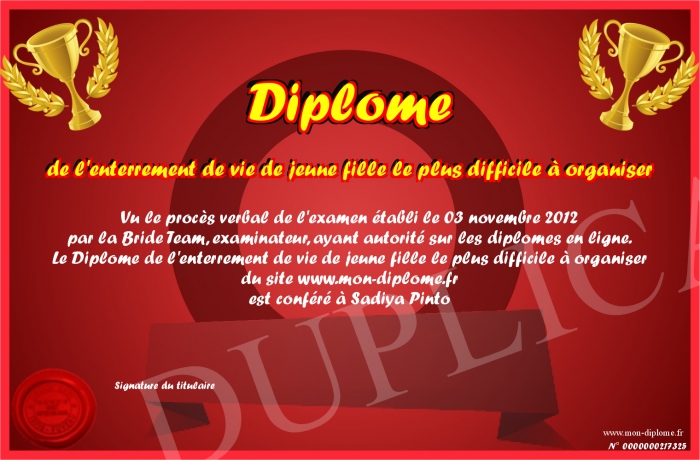 Envoyez par email votre Diplôme de l'enterrement de vie de jeune fille le plus difficile à organiser personalisé
