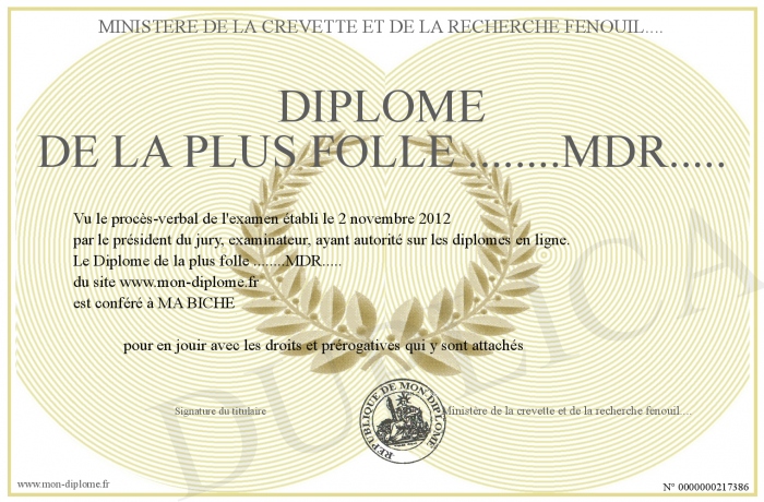 Envoyez par email votre Diplôme de la plus folle ........MDR..... personalisé