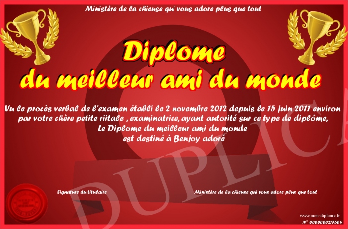 Envoyez par email votre Diplôme du meilleur ami du monde personalisé