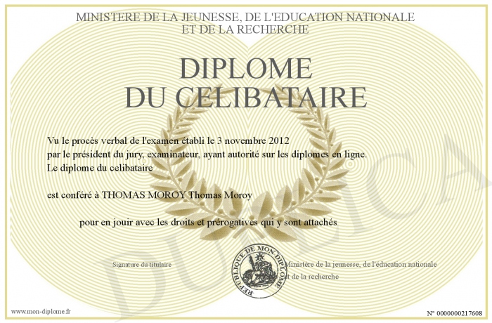 Envoyez par email votre Diplôme du Celibataire personalisé