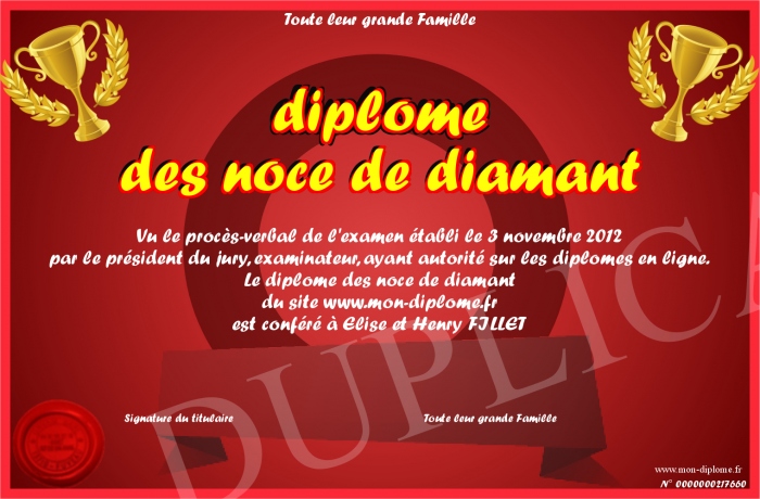 Envoyez par email votre diplome des noce de diamant personalisé