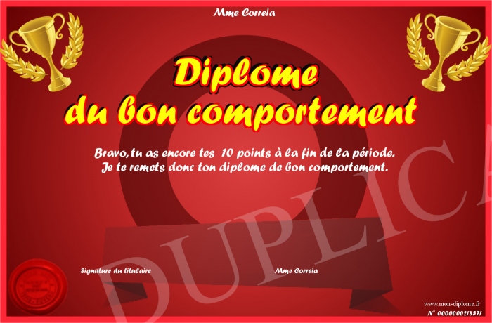 Envoyez par email votre Diplôme du bon comportement personalisé