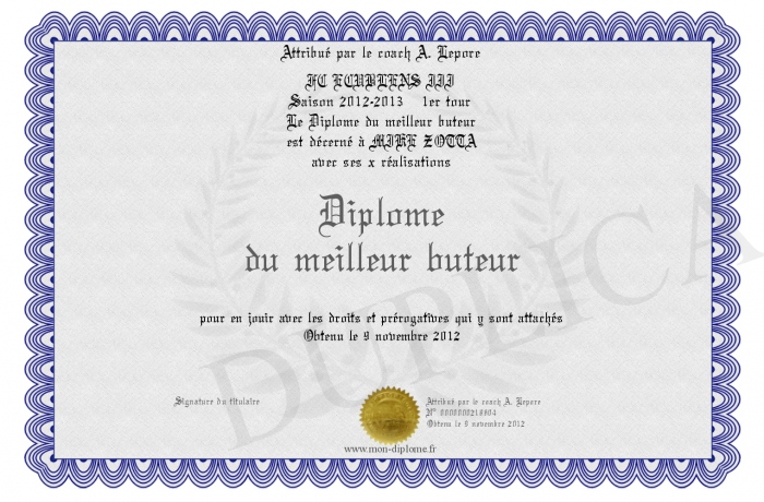 Envoyez par email votre Diplôme du meilleur buteur personalisé