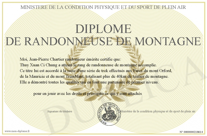 Envoyez par email votre Diplôme de randonneuse de montagne personalisé