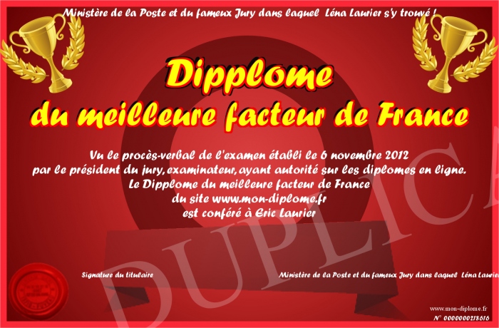 Envoyez par email votre Dipplome du meilleure facteur de France personalisé