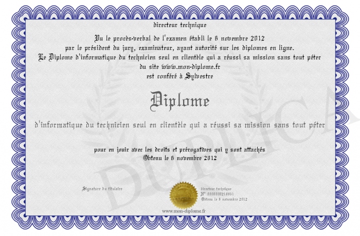 Envoyez par email votre Diplome d'informatique du technicien seul en clientèle qui a réussi sa mission sans tout péter personalisé