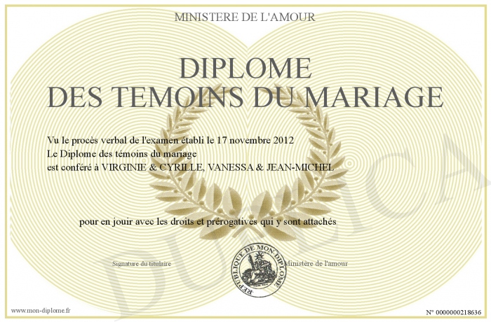 Envoyez par email votre Diplôme des témoins du mariage personalisé