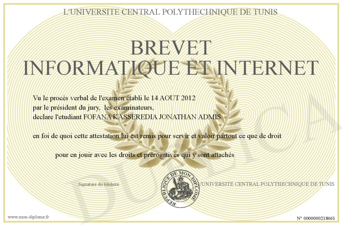 Envoyez par email votre BREVET INFORMATIQUE ET INTERNET personalisé
