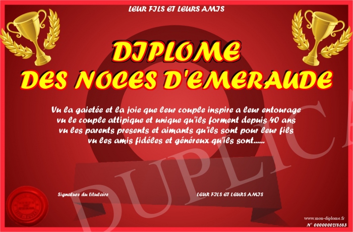 Envoyez par email votre DIPLOME DES NOCES D'EMERAUDE personalisé