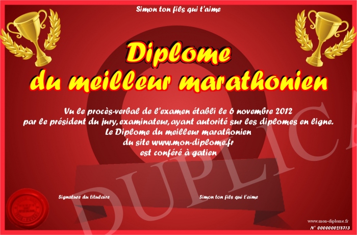 Envoyez par email votre Diplôme du meilleur marathonien personalisé