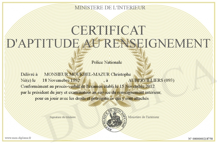 Envoyez par email votre Certificat d'aptitude au renseignement personalisé